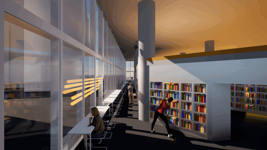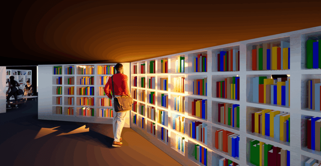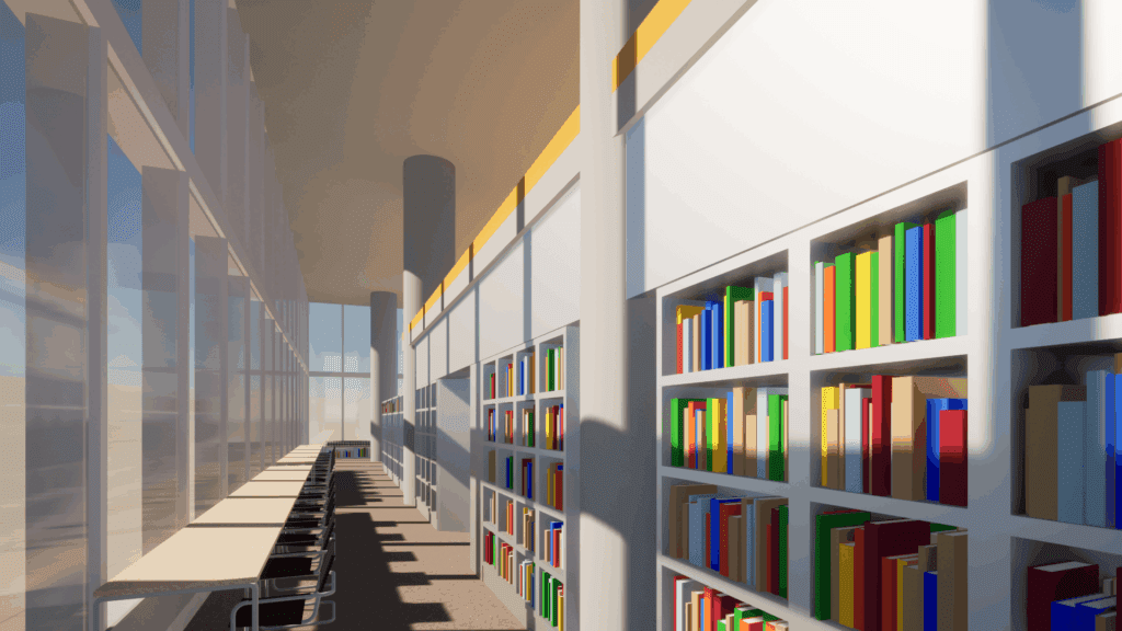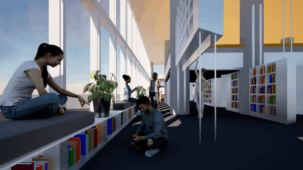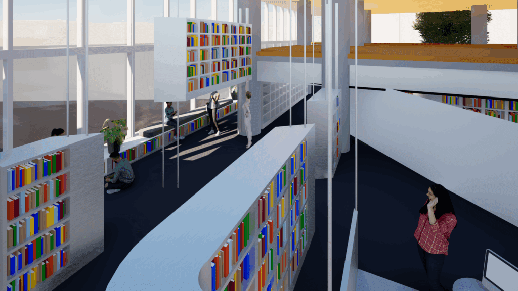 Le confort des usagers étant tout aussi important, nous avons pensé à mettre à profit les zones mortes de cette bibliothèque (sous les fenêtres, près des murs…) en les transformant en zones de repos.